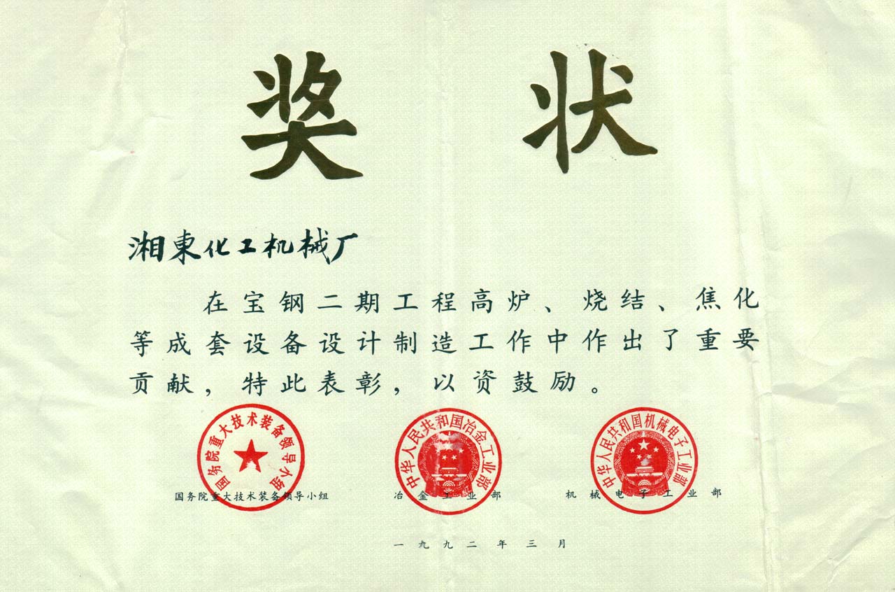 宝钢二期工程高炉/烧结/焦化等成套设备奖状